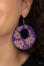 The front of a purple wooden frame is delicately etched in a flowery tropical pattern, creating a colorful hoop. Earring attaches to a standard fishhook fitting.