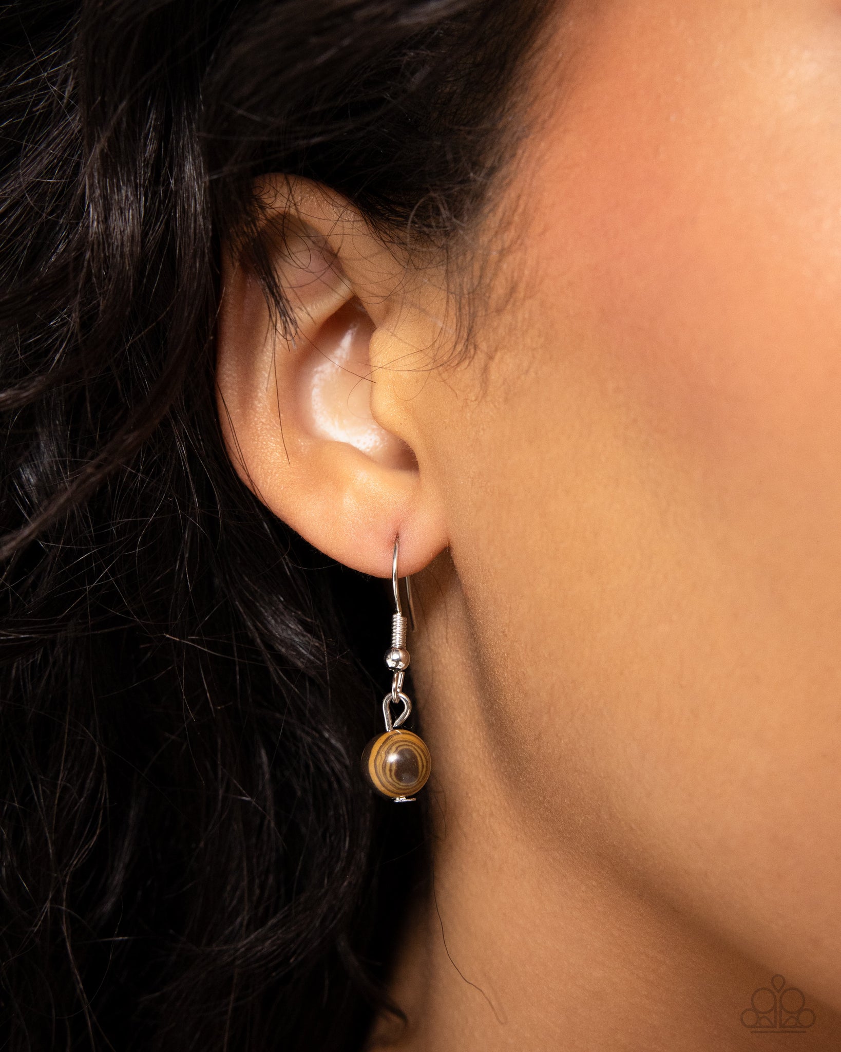 Pressed into a thick circular frame, a wood-like stone dangles from the ear for an elegantly earthy display. Earring attaches to a standard fishhook fitting. As the stone elements in this piece are natural, some color variation is normal.