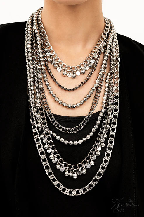 Featuring a range of oval and curb style links, a chaotic assortment of bulky silver and gunmetal chains fearlessly layers down the chest. Polished silver beads and textured silver discs swing from the thick curb chains, introducing audible shimmer to the intense industrial design. as two strands of high-sheen silver beads, chiseled into faceted metallic accents, drape between the mashup of tiered chains in a dramatic finish. Features an adjustable clasp closure.