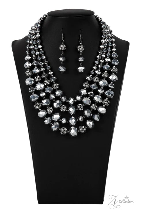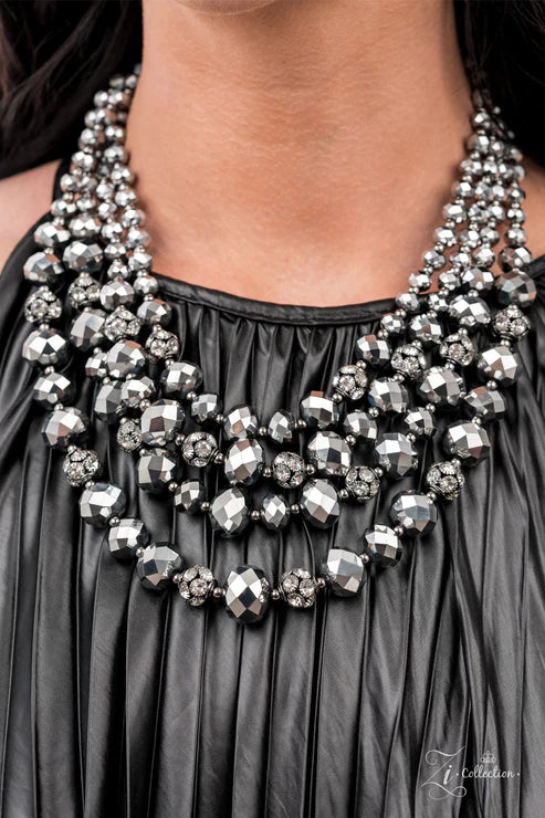 Gradually increasing in size and intensity, dainty gunmetal beads, faceted hematite-like crystals, and white rhinestone studded gunmetal ornaments unapologetically connect into dauntless rows below the collar. The radiantly regal layers flash and refract the light, creating a smoldering statement piece. Features an adjustable clasp closure.
