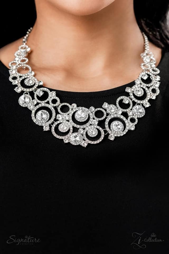 Dozens of circular silver frames are encrusted in shimmery white rhinestones and link together to create a dizzying display along the collar. The frames gradually increase in size as they lead to the center, boldly showcasing their stunning detail. Solitaire white rhinestones, wrapped in a border of dainty sparkling accents, are sporadically sprinkled throughout the lacy canvas, with square-cut rhinestones in pronged settings adding three-dimensional dazzle. Features an adjustable clasp closure.