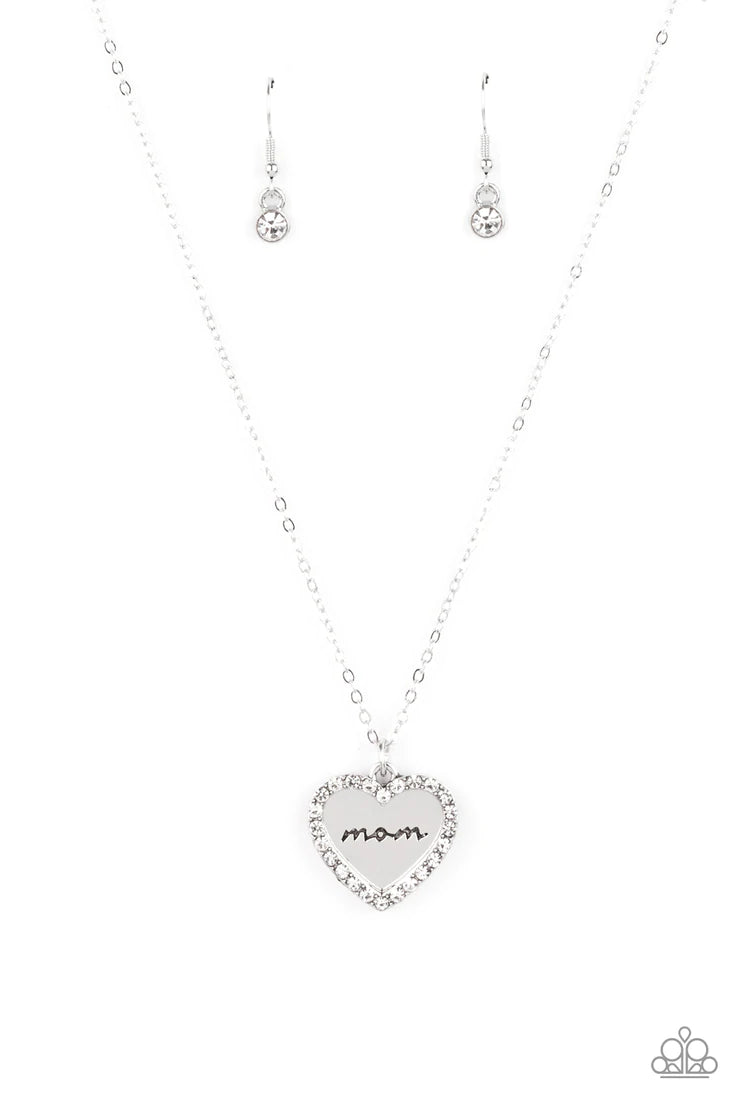 Infused with a glassy white rhinestone encrusted silver heart, a silver heart shaped pendant is stamped in the word, "Mom," as it swings below the collar, creating a sparkly sentimental statement piece. Features an adjustable clasp closure.