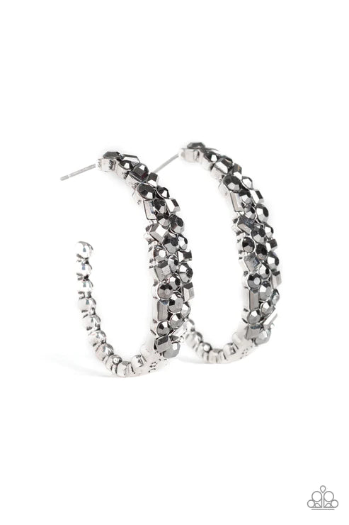 The front of a hook-shaped silver hoop is encrusted in a collision of smoky hematite rhinestones for a blinding look. Earring attaches to a standard post fitting. Hoop measures approximately 1" in diameter.