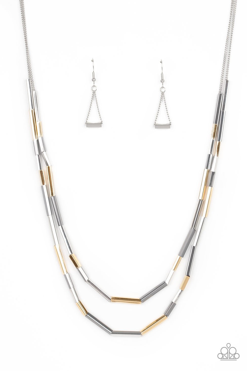 A collection of silver, gold, and gunmetal square rods slide along two dainty silver chains below the collar, creating edgy metallic layers. Features an adjustable clasp closure.